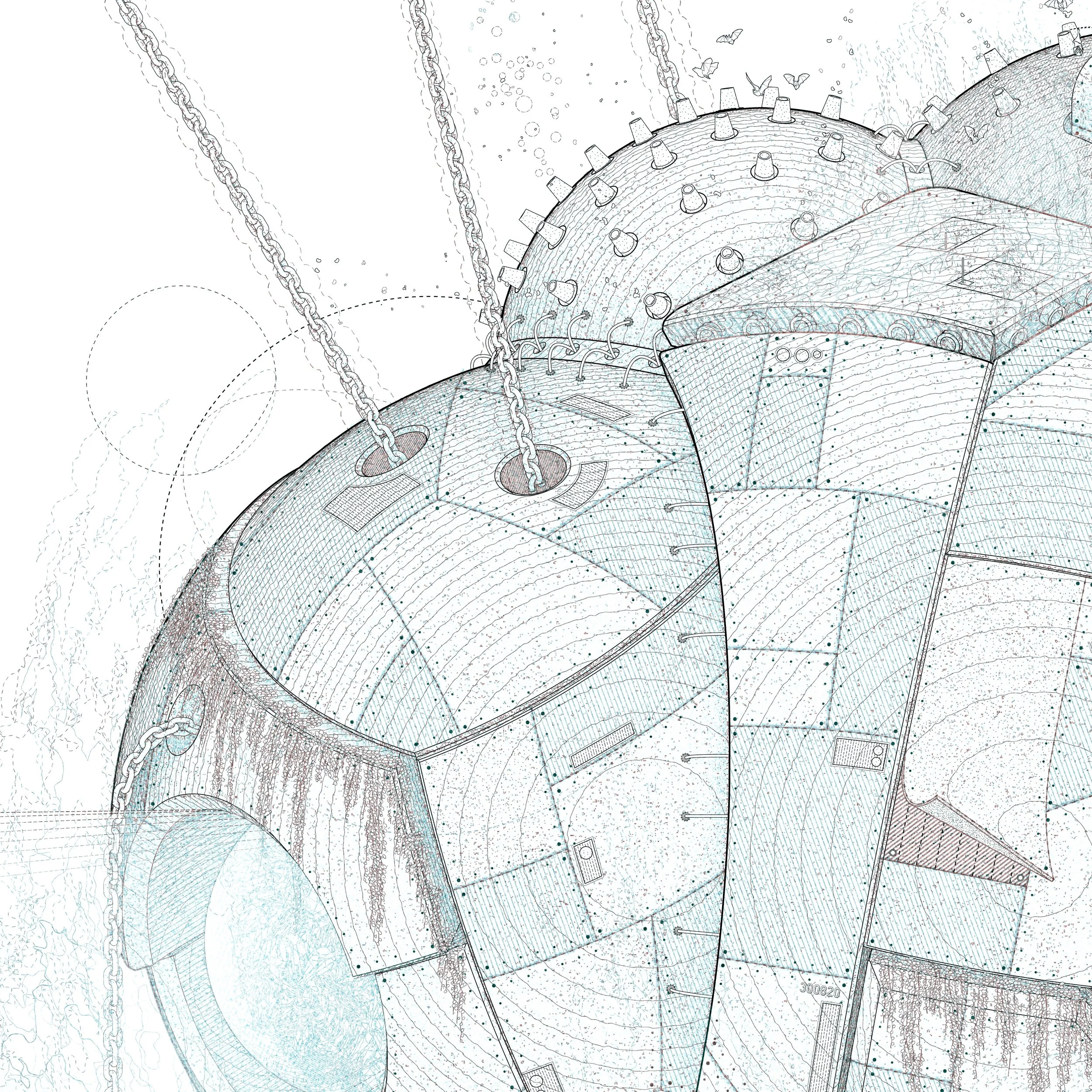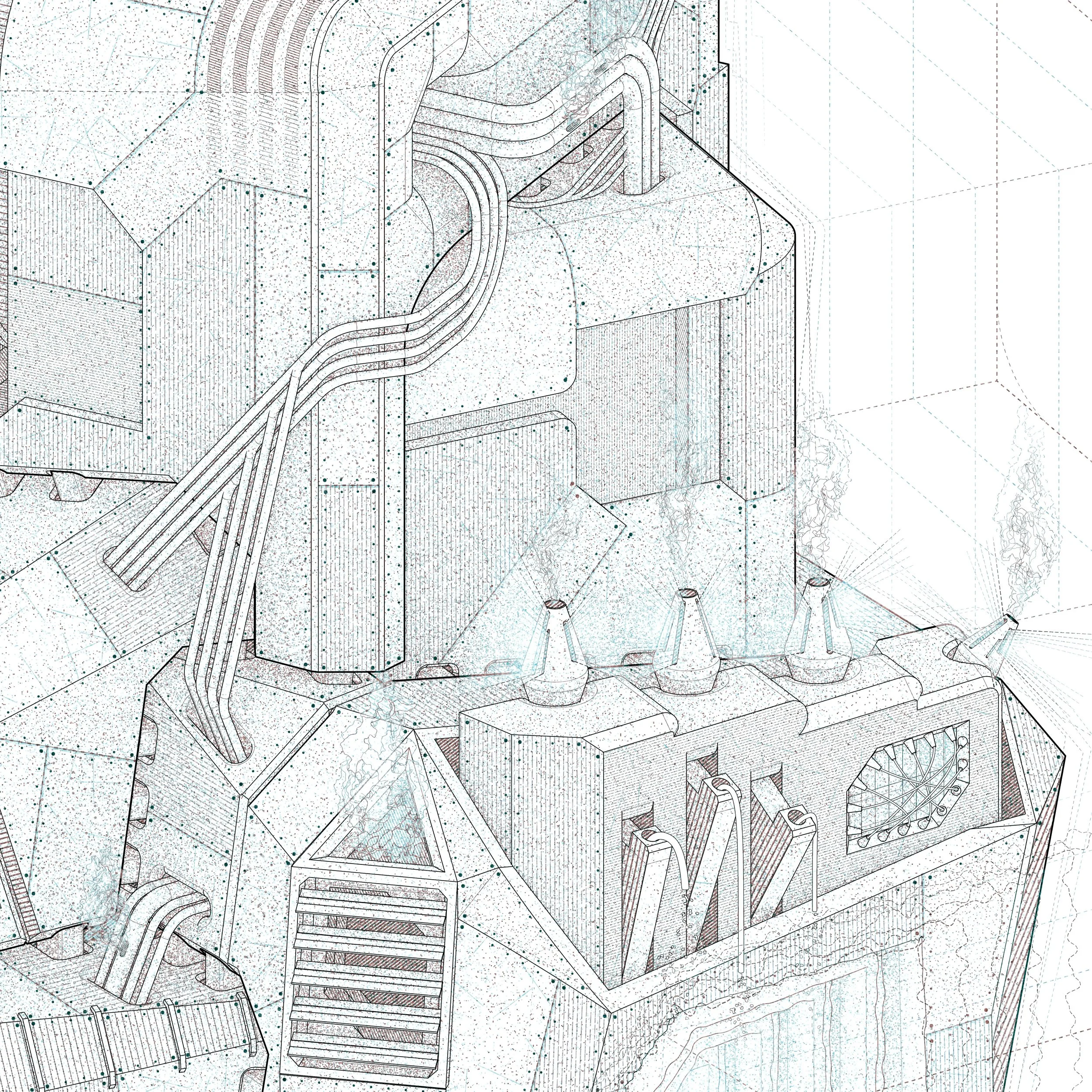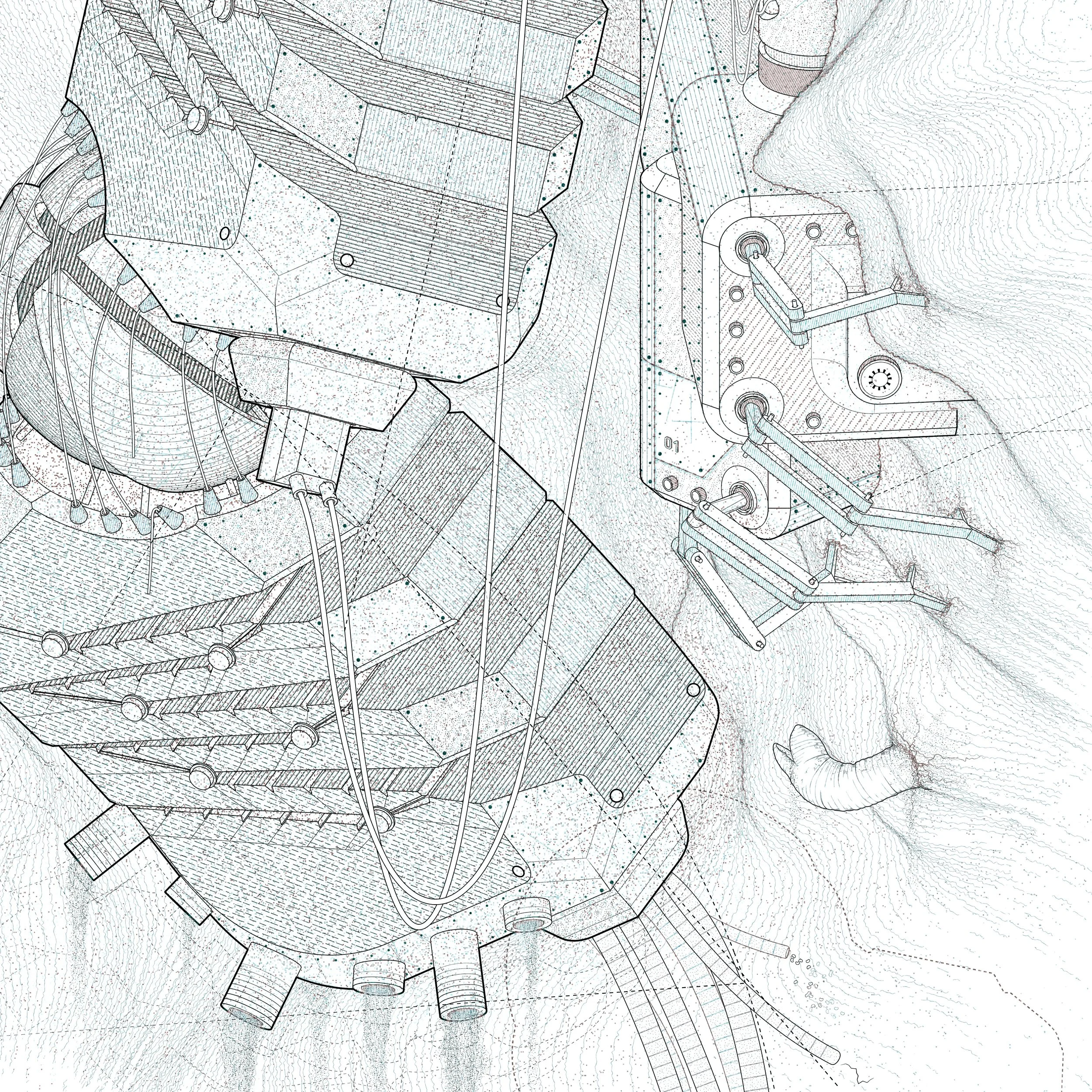 This series of drawings illustrates a world of obscure nonhuman architectural beings, possessing qualities both familiar and bewildering. These Compound Kaiju are kinetic and discreet, demonstrating autonomy while suggesting a symbiotic relationship with their environment. Their origins, age, and motives remain a mystery.