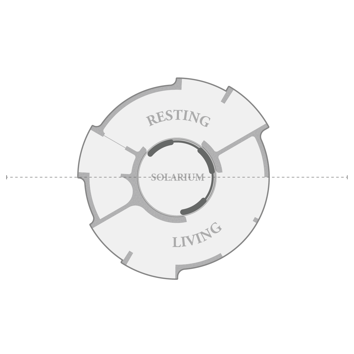The plan is organized into 4 separate spaces - living, resting, toilet and the solarium. These spaces are each given different proportions of the 12-piece radial grid, further subdivided to increase the usability of each room.