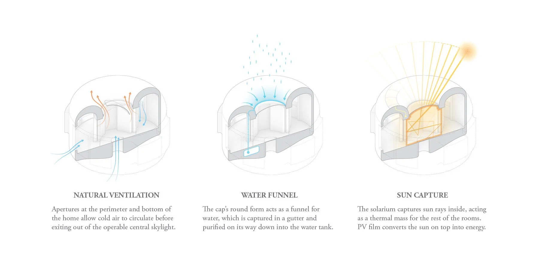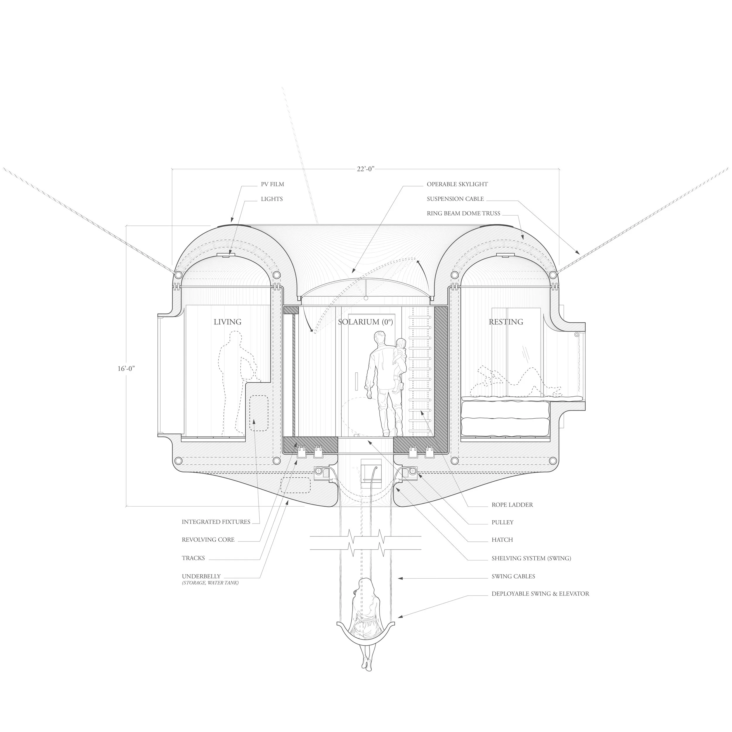 Users can access the home through the swing elevator, deployable balcony or the operable skylight - depending on the condition in which the home resides in. Inside, the domed geometry provides tall ceiling heights in the rooms, each offering integrated fixtures and unique window profiles.